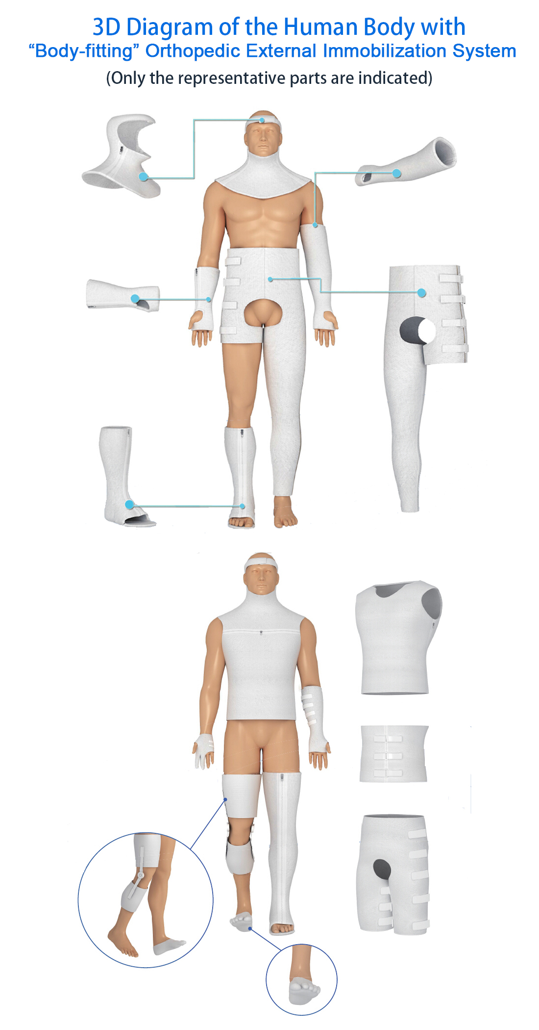 “ ‘Body-fitting’ Orthopedic External Immobilization System” is mainly used in the rigid immobilization of bone fracture and in the flexible immobilization of other bone diseases such as bone aging, osteoporosis, severe sprains, etc. It can fix all of the complicated body parts and satisfy the personalized need of special fracture immobilization in the developed regions of big and middle sized cities. With respect to plaster and polymer casting tape, our product leads the second technological revolution in the field of orthopedic external fixation, which avoids three major drawbacks of the above two products: not suitable for immobilizing the complicated body parts; non-personalized treatment; not ideal for children fracture fixation.