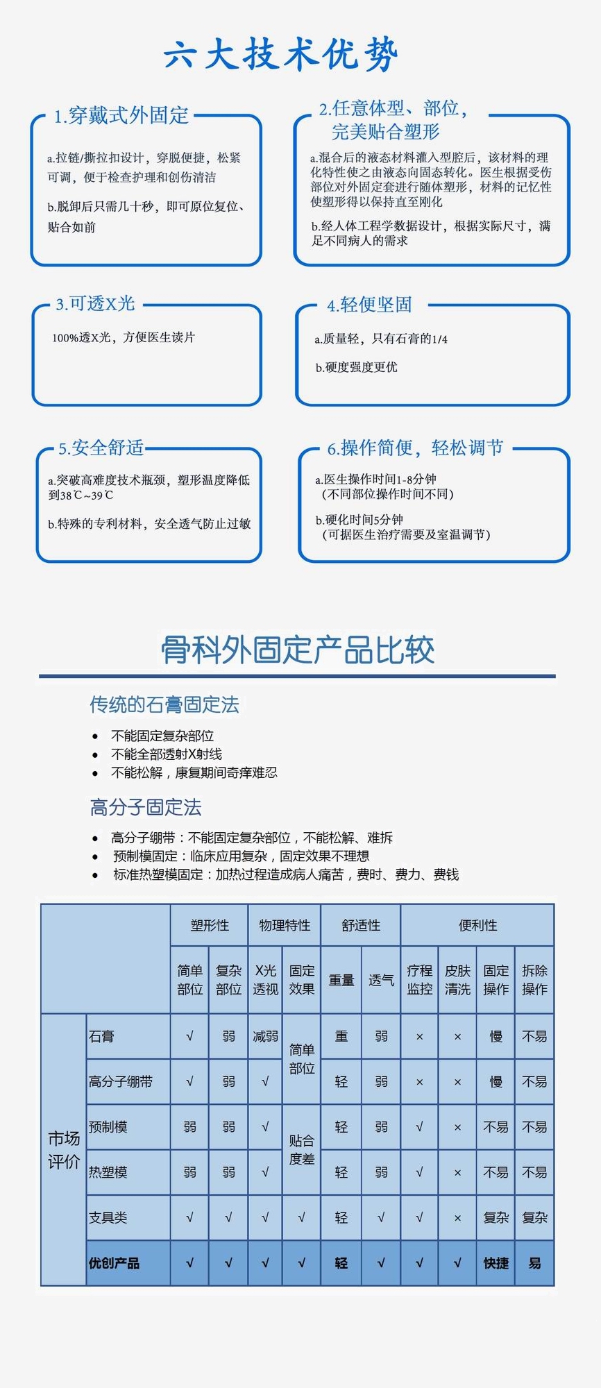 5.其重量是石膏的1/5,強(qiáng)度超過石膏,使醫(yī)生能自如操作開合結(jié)構(gòu),便于對(duì)病人做表皮清潔處理和檢查,防止肌肉萎縮。